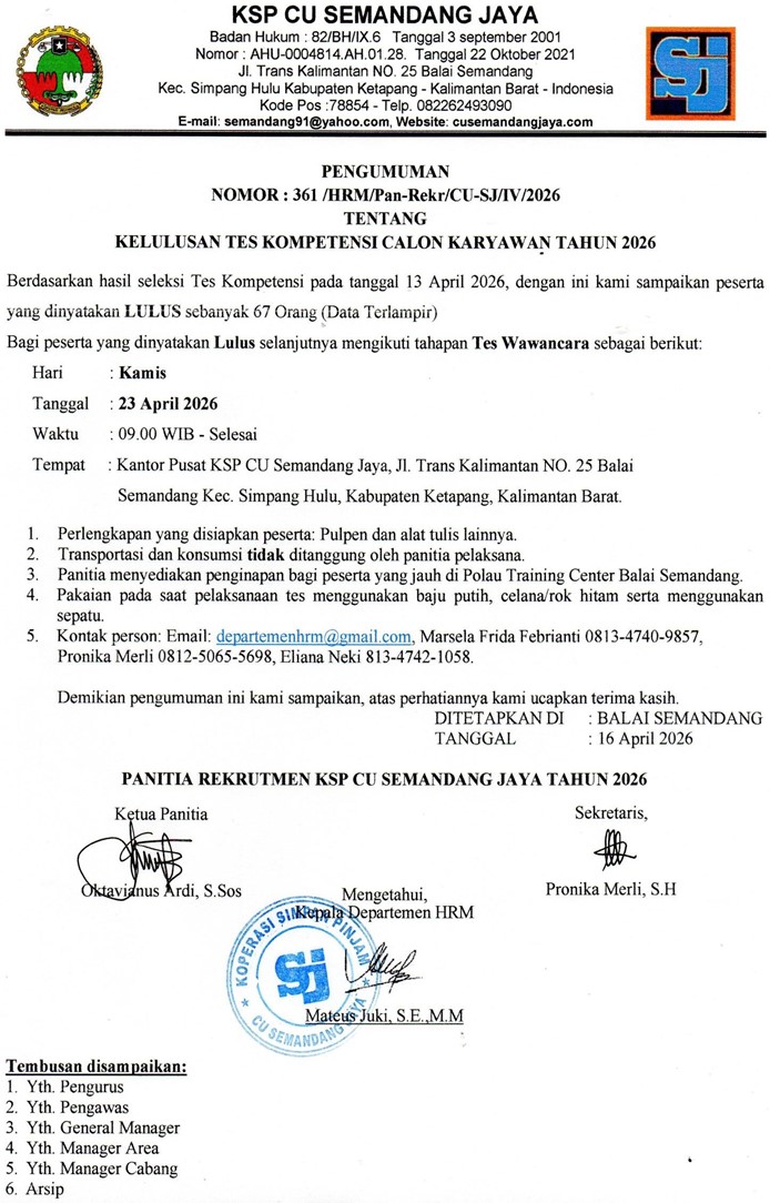 PENGUMUMAN HASIL SELEKSI TES KOMPETENSI CALON KARYAWAN CUSJ APRIL 2026